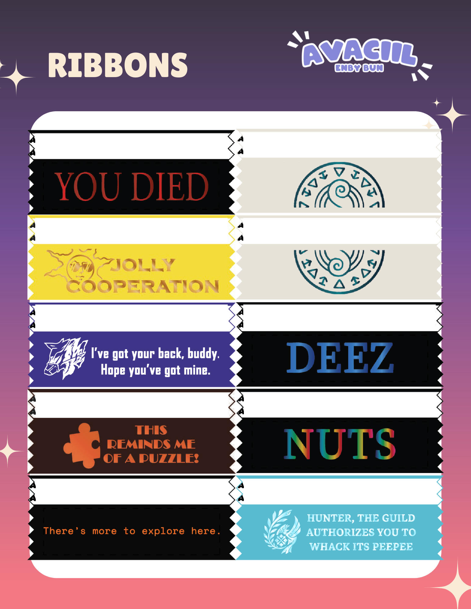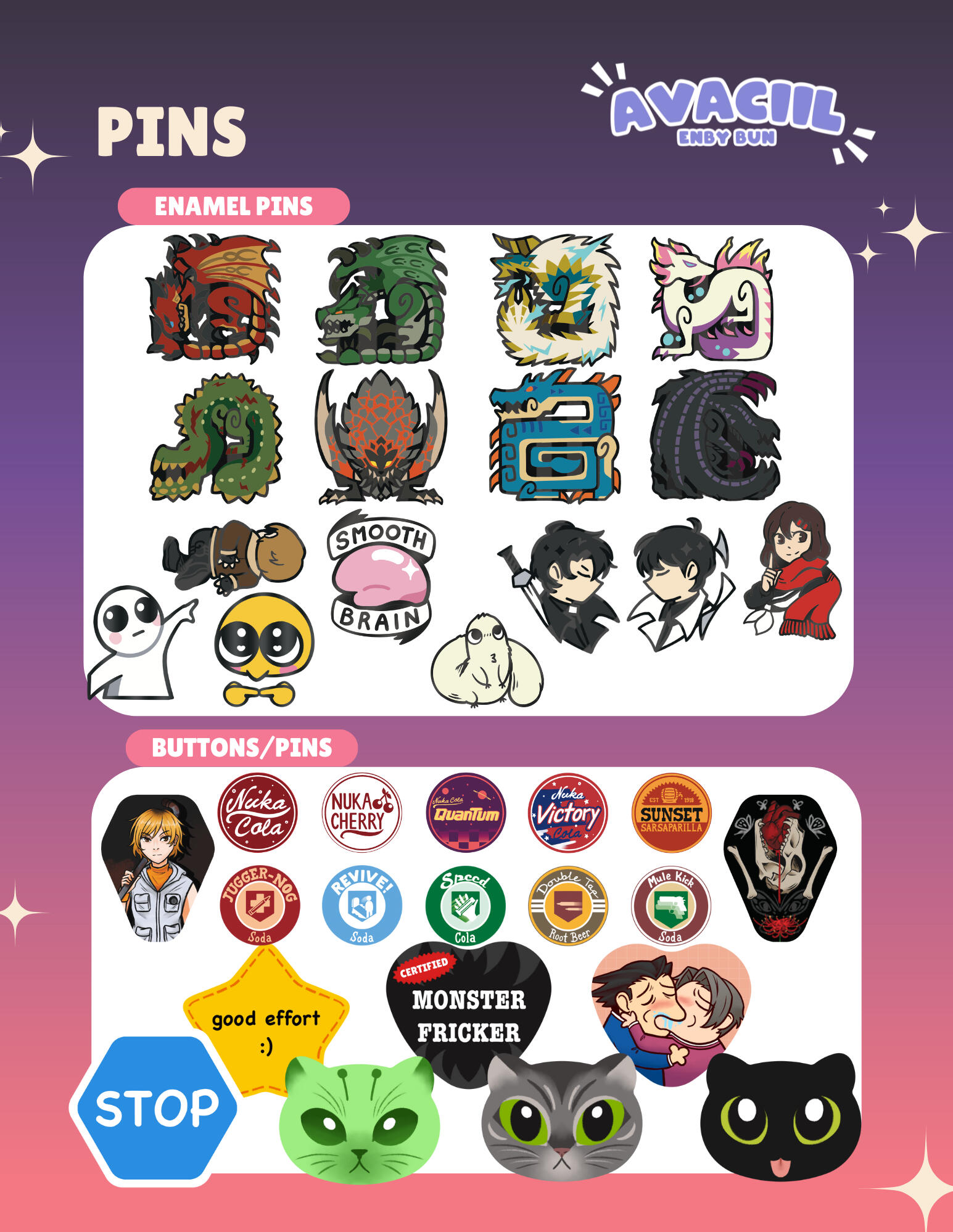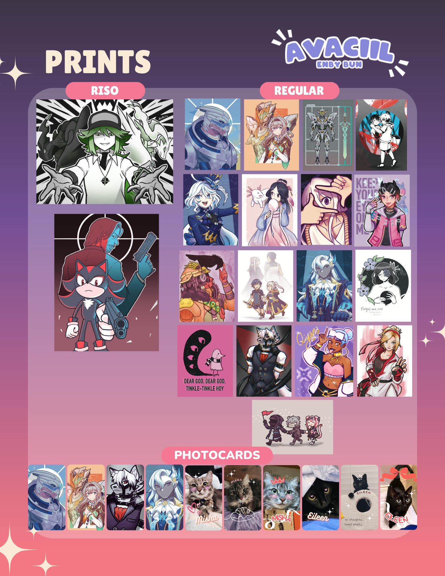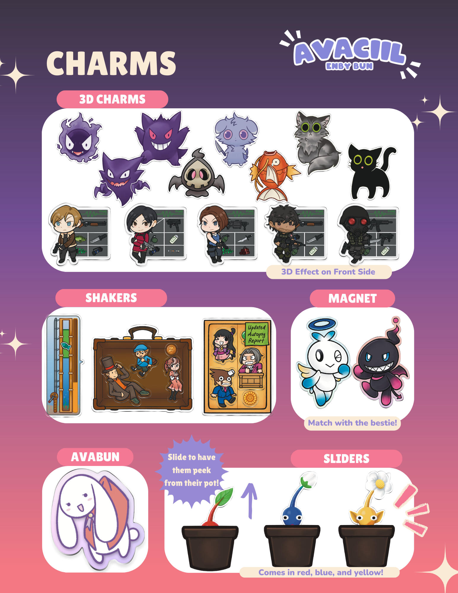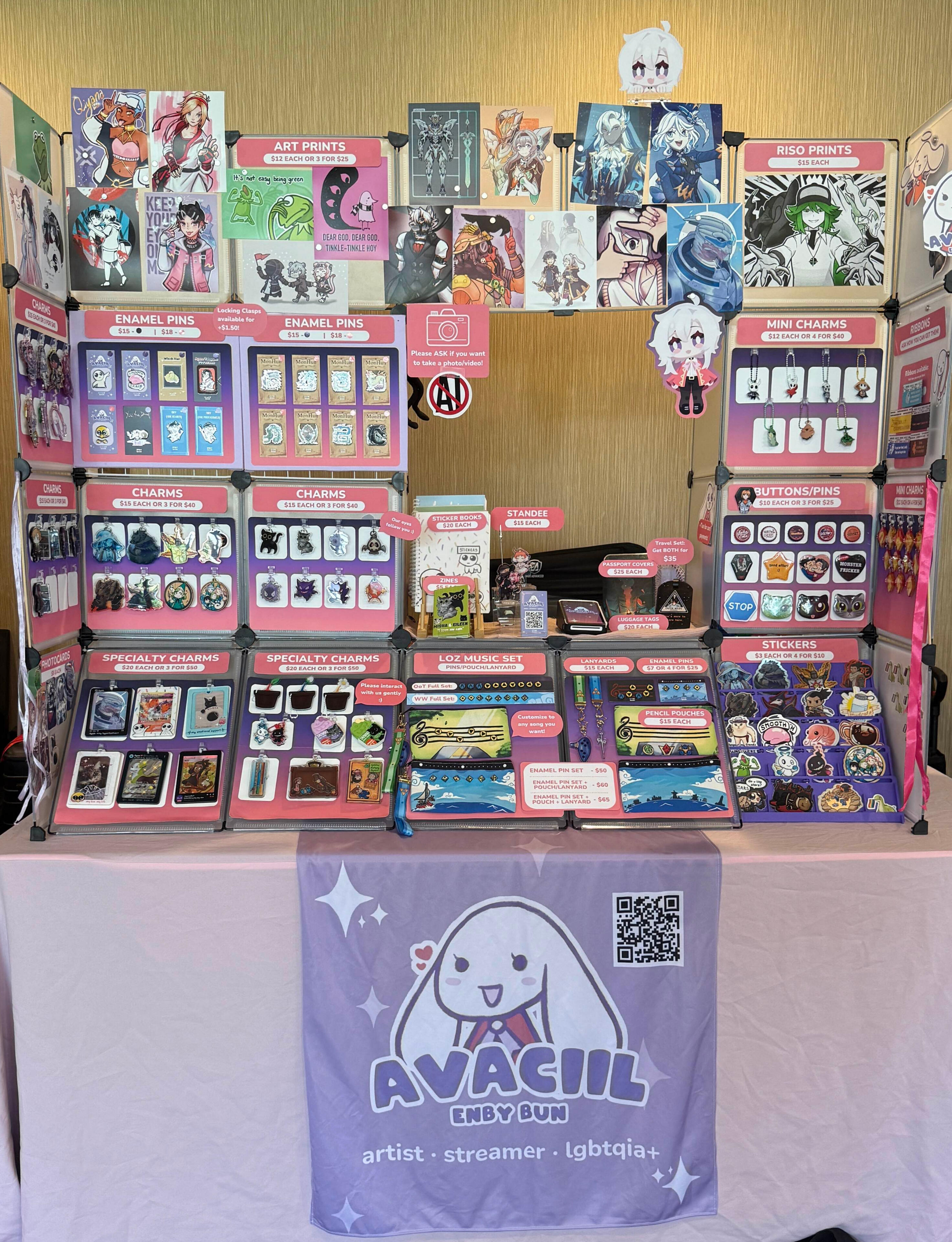 Hello! I'm Ava otherwise known as avaciil. I'm an LGBTQIA+ artist based in San Diego, California. I have a penchant for video games and I celebrate that by drawing my favorite characters. I draw various original and fanwork that come out to the shape of prints, charms, buttons, enamel pins, and silly stickers. I started my store at the beginning of 2023 and started tabling that October. I'm constantly striving to improve and expand my store. On top of being an artist, I'm also a variety streamer on Twitch as an animated bunny Vtuber.Thanks for taking the time to check out my portfolio! You can find my online storefront here.