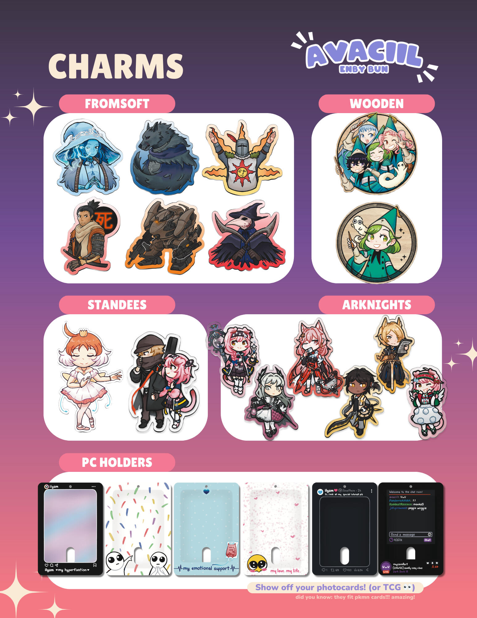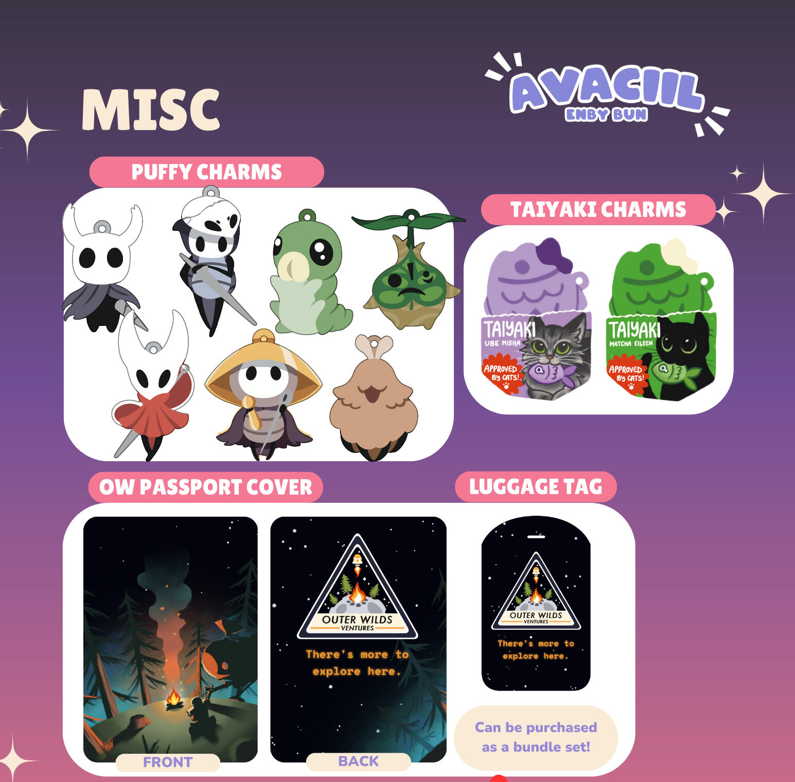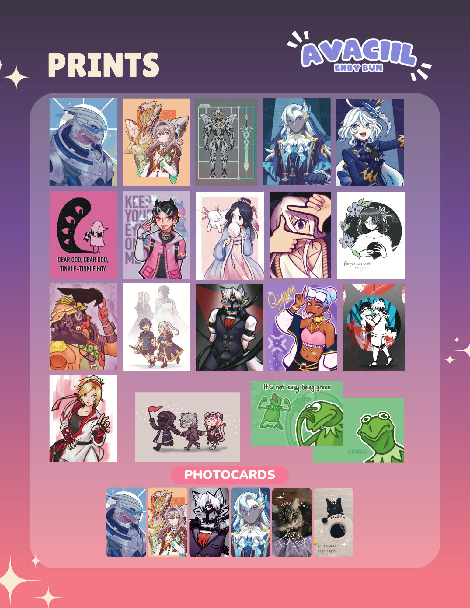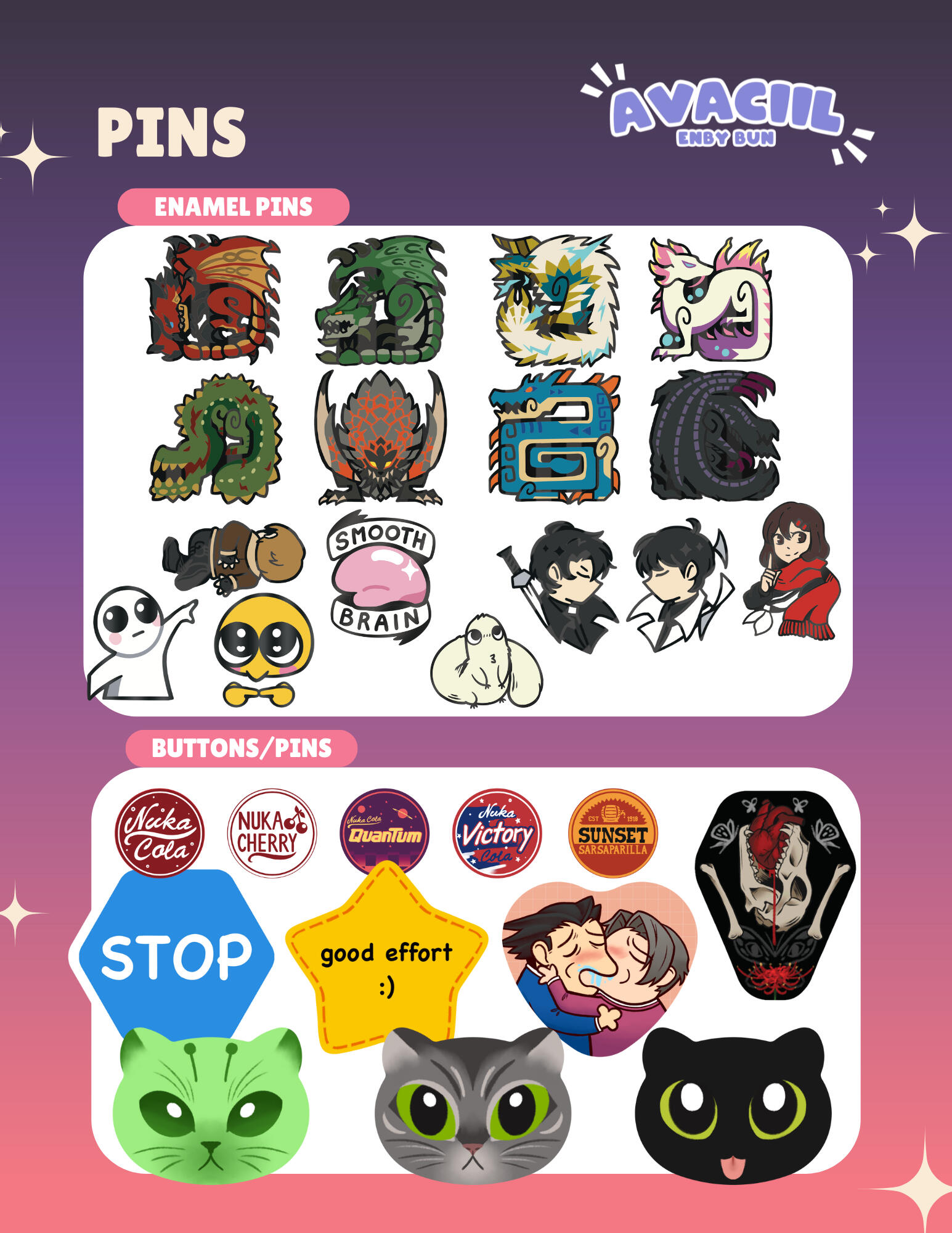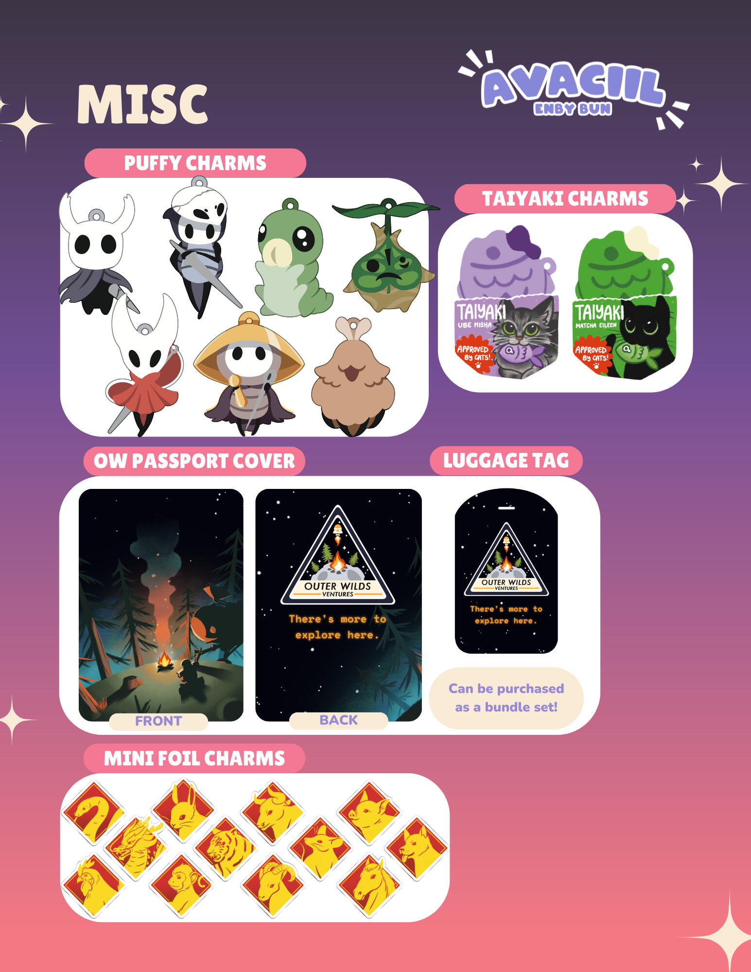 Hello! I'm Ava otherwise known as avaciil. I'm an LGBTQIA+ artist based in San Diego, California. I have a penchant for video games and I celebrate that by drawing my favorite characters. I draw various original and fanwork that come out to the shape of prints, charms, buttons, enamel pins, and silly stickers. I started my store at the beginning of 2023 and started tabling that October. I'm constantly striving to improve and expand my store. On top of being an artist, I'm also a variety streamer on Twitch as an animated bunny Vtuber.Thanks for taking the time to check out my portfolio! You can find my online storefront here.